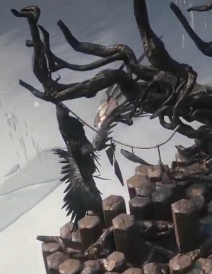 Kalandra's body hanging from a large, withered tree.