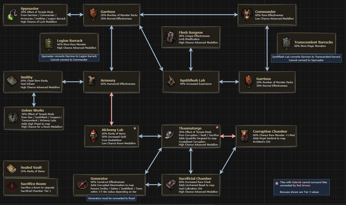 A diagram showing what rooms can connect to what other rooms as well as some helpful information about each room.
